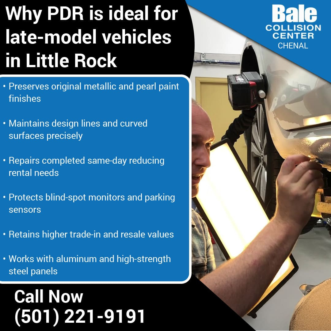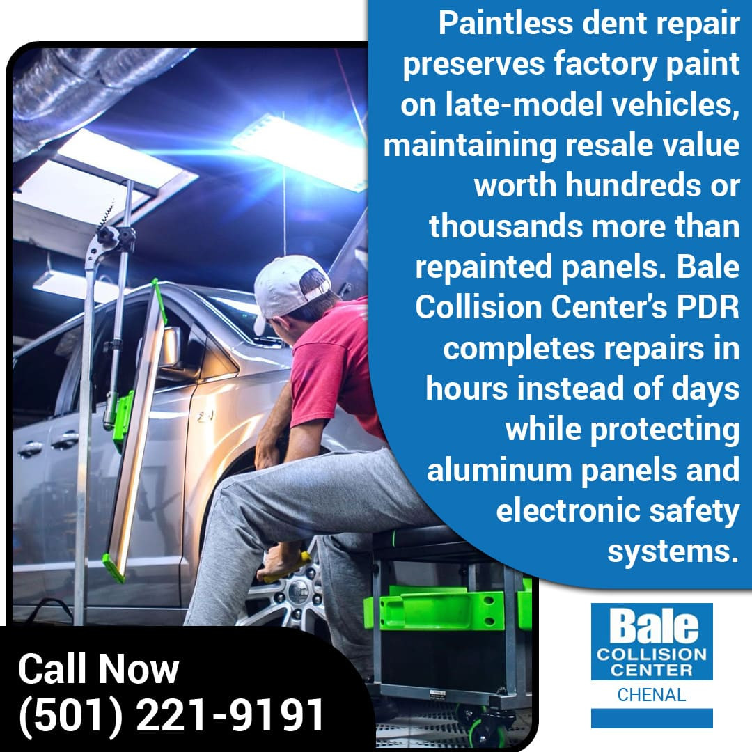 Paintless dent repair is an ideal solution for late-model vehicles. It maintains factory finishes, preserves resale value, and offers cost- and time-efficient results. Contact Bale Collision Center at (501) 221-9191 or bccwlr@baleautomotive.com for professional PDR in Chenal Parkway, Little Rock, AR.